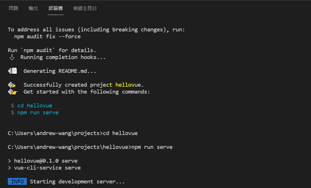 - 使用 VSC 內的終端機建立一個標準的 Vue 3 Project